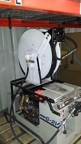 Model G-21D55-53-S split circuit, 21 hp, Dual 5GPM, single 10GPM flow, gas powered, HTMA flat faced couplers included, large capacity hydraulic cooler to extend power unit life, fuel level gauge, hour meter, electric start, self-contained Hannay hose reel, lockable control panel cover, roll over protection frame, lifting points.